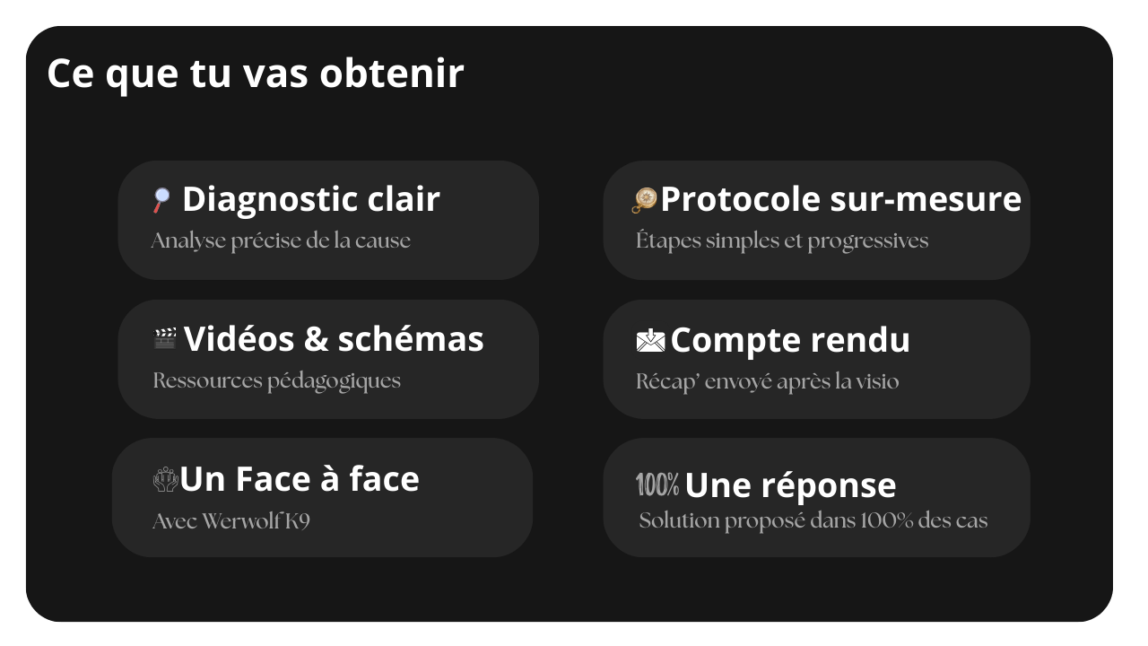 Aux propriétaires qui veulent un plan concret, des résultats visibles et un accompagnement de WERWOLF K9 sans se déplacer.