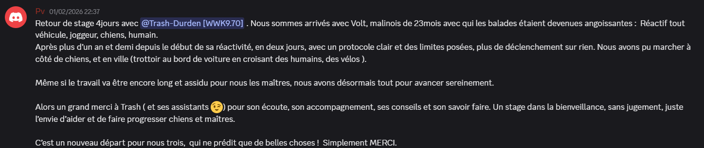 (Autocontrôle, Marche en laisse, Ordres de bases, etc)